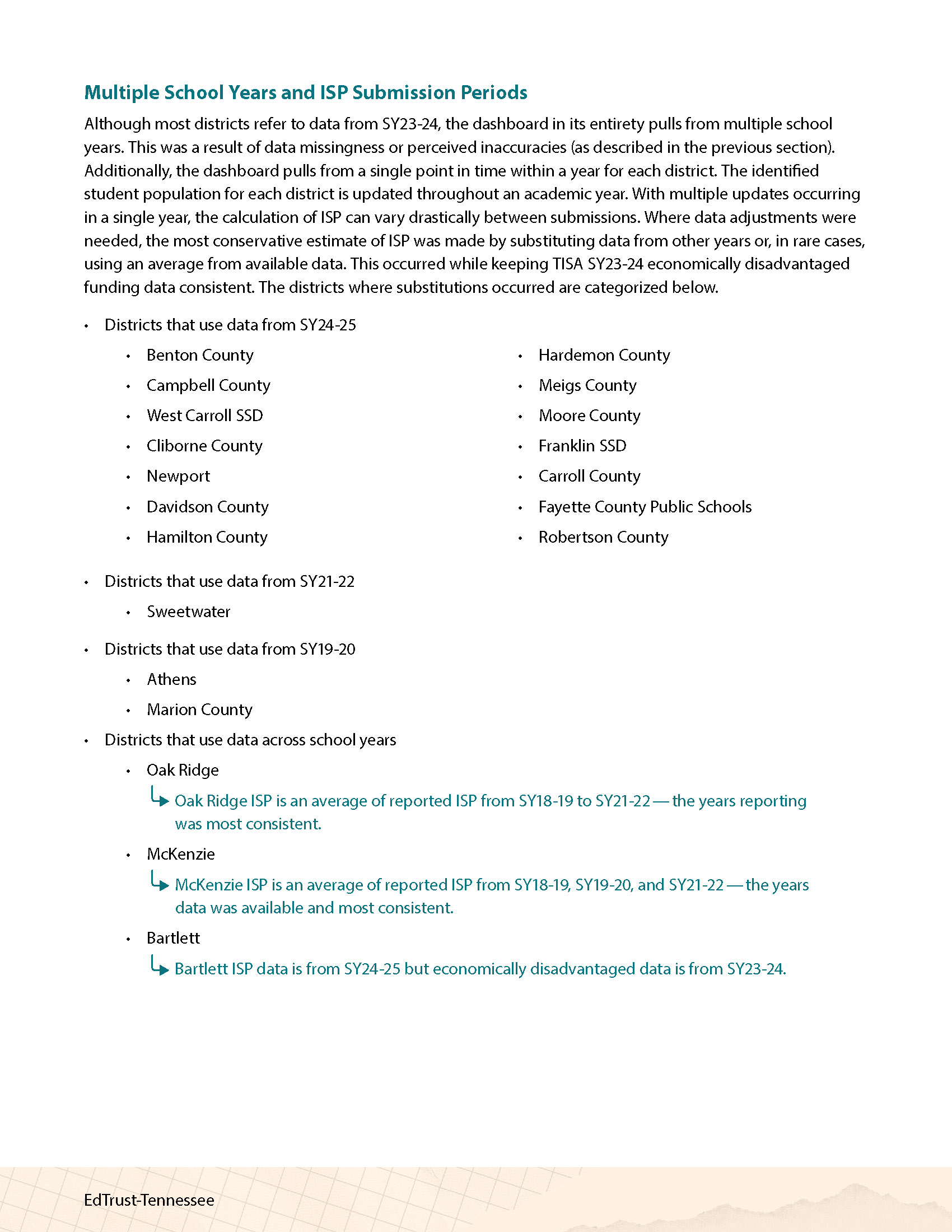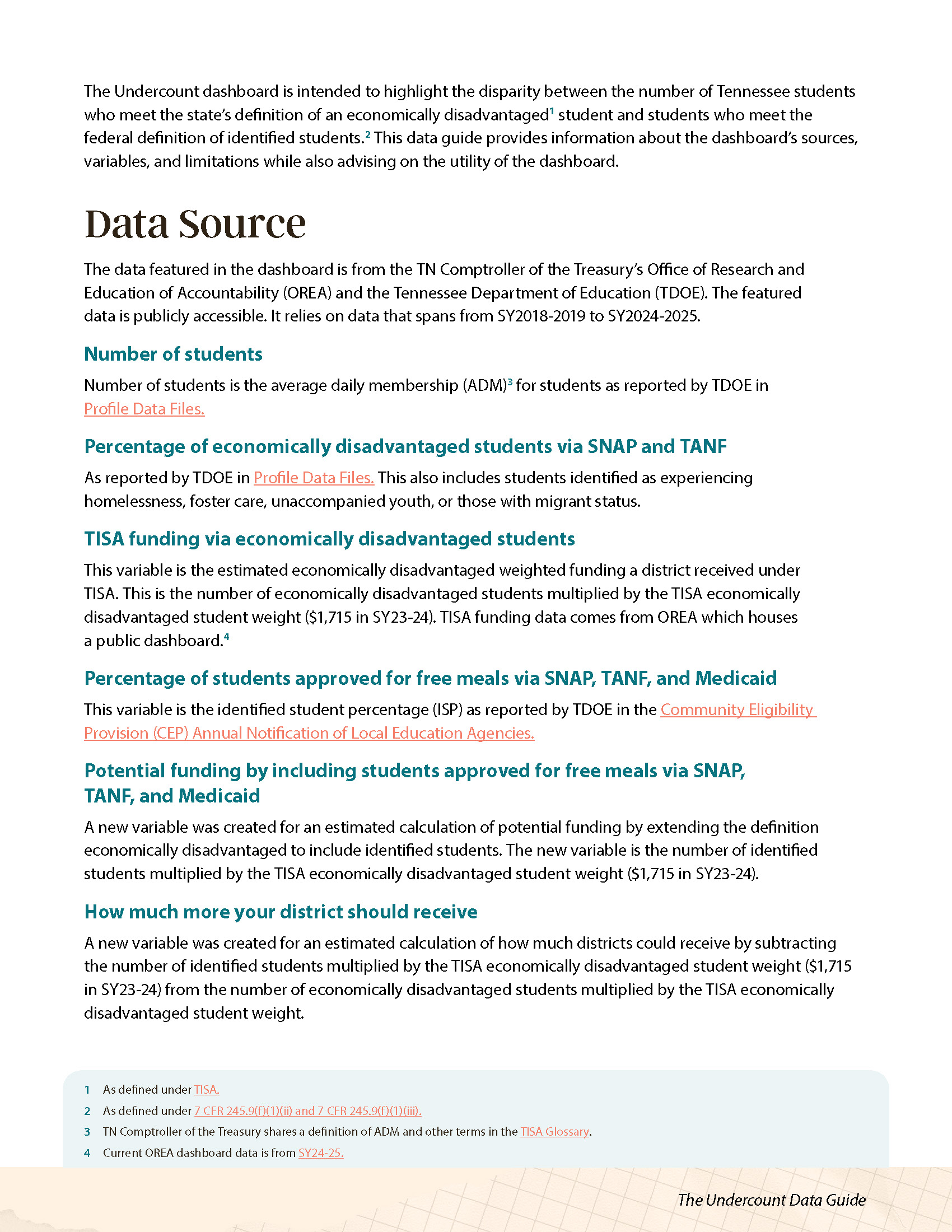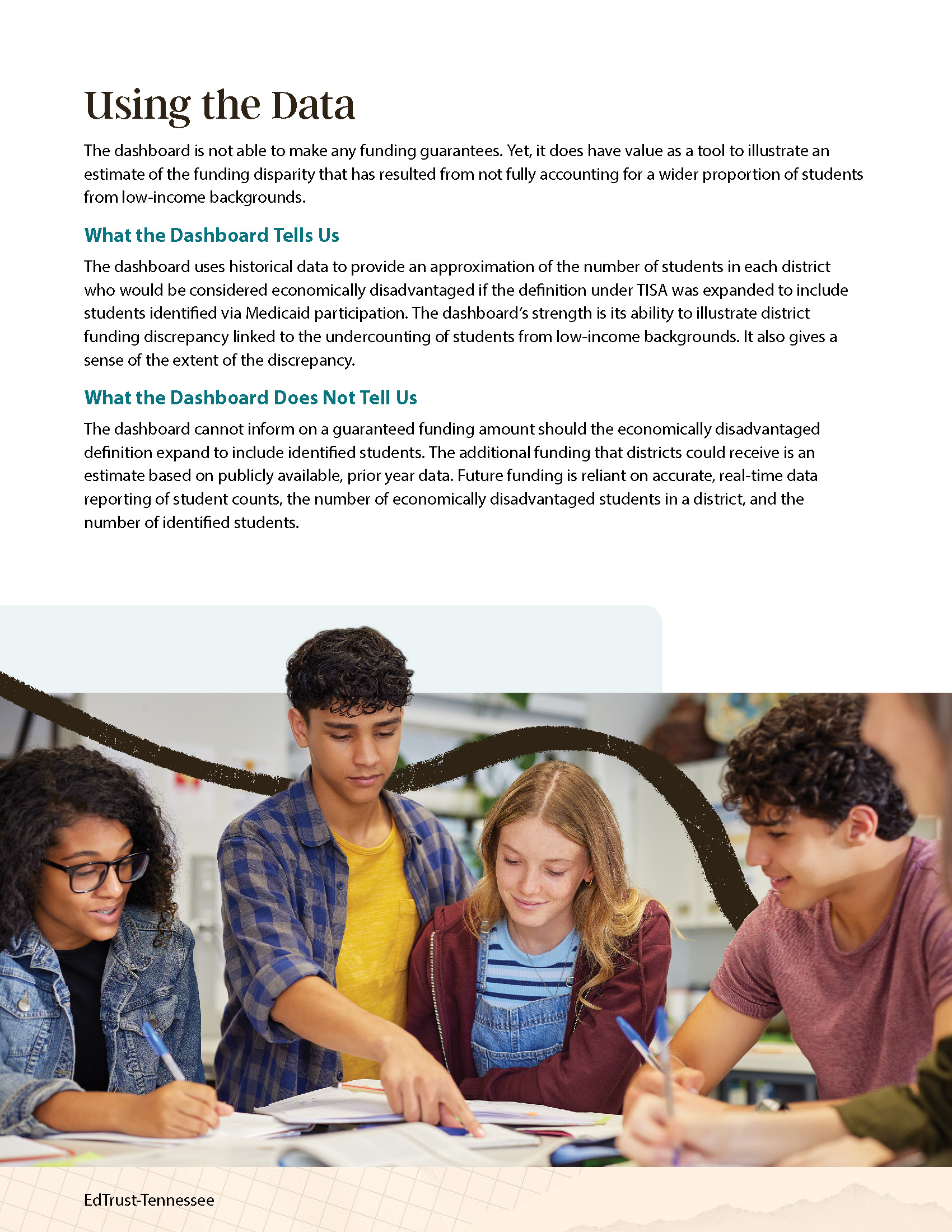 This dashboard highlights the disparity between the number of Tennessee students who meet the state’s definition of an economically disadvantaged student under TISA and students who meet the federal definition of identified students under the federal definition of identified students. Based upon estimates from historic data, the dashboard visually demonstrates the restrictive nature of the definition of “economically disadvantaged,” and why Tennessee’s definition must be revised to more accurately identify and support students from low-income backgrounds.